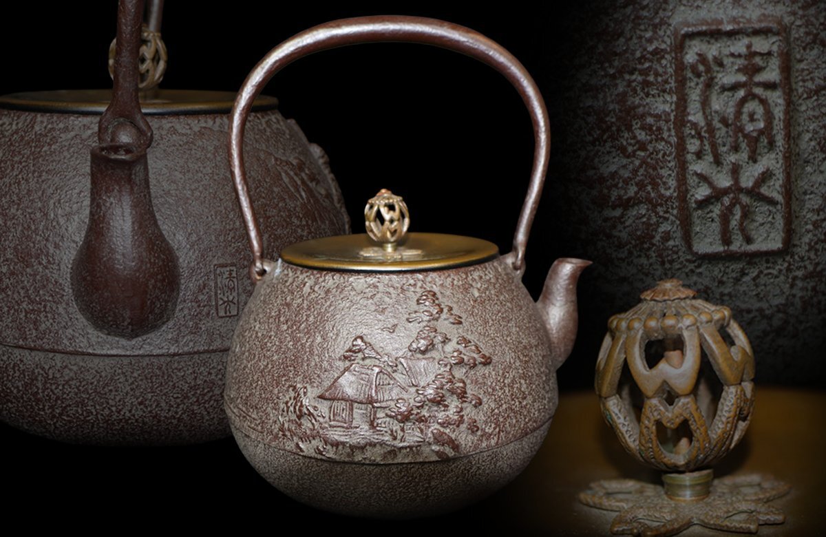 > 【江】釜師名人 精光造 楼閣風景文透かし彫摘姥口丸形鉄瓶 高さ21.5㎝ 古美術品(茶道具茶器薬缶湯沸) X1795 CTDBokja