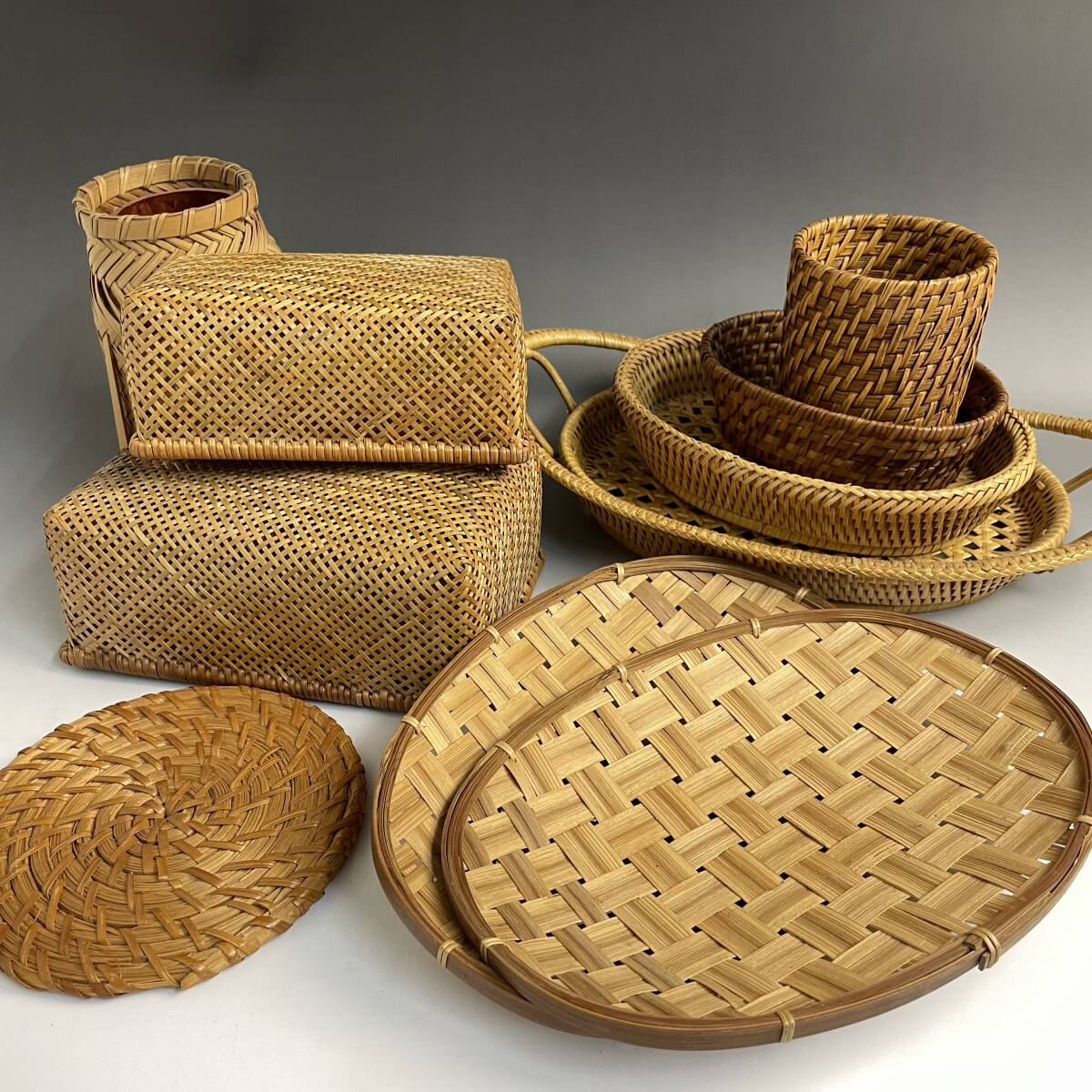- KF14/30 竹細工 竹籠 花器 まとめて 10点 花入れ 花瓶 竹細工 竹器 ざる 葛籠 竹かご 和室 インテリア 竹工芸 古道具 古民具◎