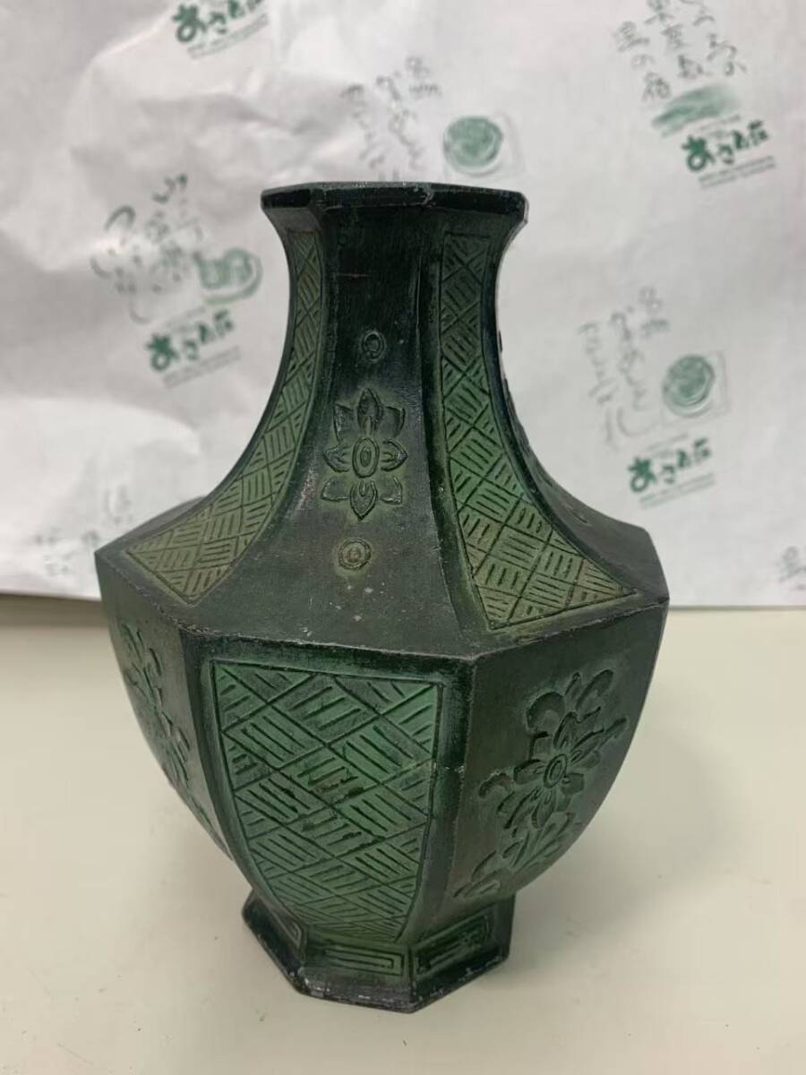 > S1-8-4→伝統工芸 工芸品飛州 銅器? 花図 菱柄 八角 *金属工芸 花道具 インテリア 古物 古道具 骨董 花瓶 置物 アルミ? 詳細不明 中古