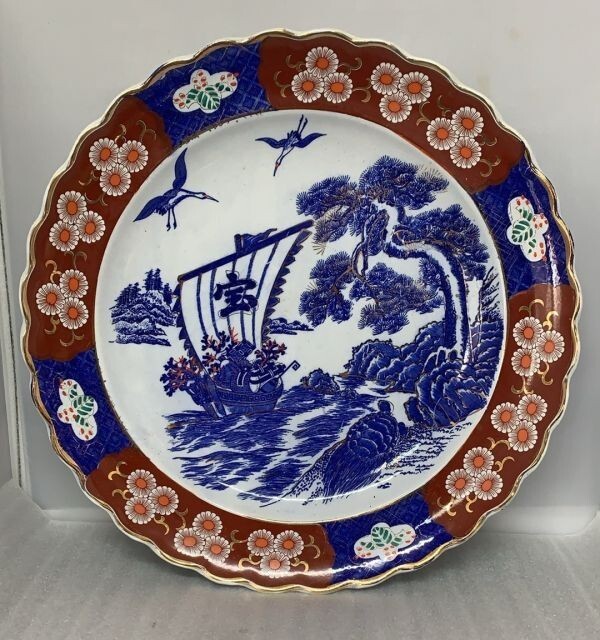 > B1027→大皿 陶磁器 盛り皿 金の縁 盛皿 和食器 宝船 染付 丸皿 縁起物 亀 鶴 鶴亀