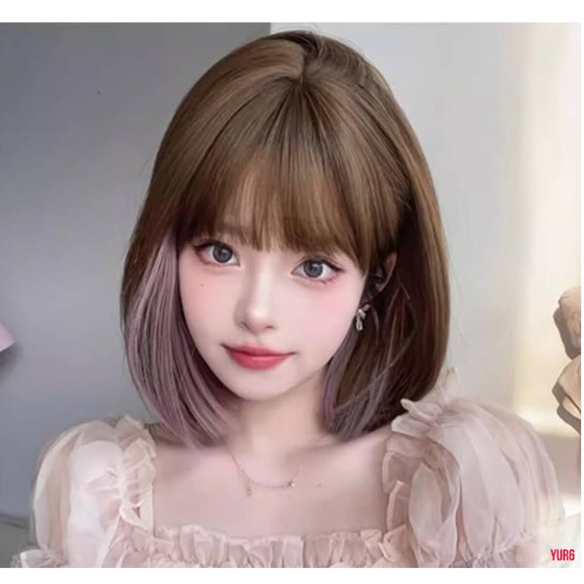 - インナーピンク * ブラウンベース ショートボブ ウィッグ フルウィッグ レディース 耐熱ファイバー 人工頭皮 かつら 普段使い イベント