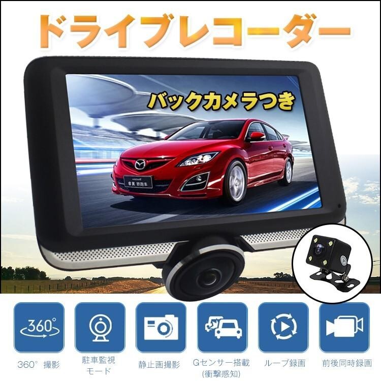 - 送料無料 ドライブレコーダー 360度 前後左右 2カメラ 一体型 ドラレコ 4.5インチ 12V シガーソケット バックカメラ付 リア用 ee191