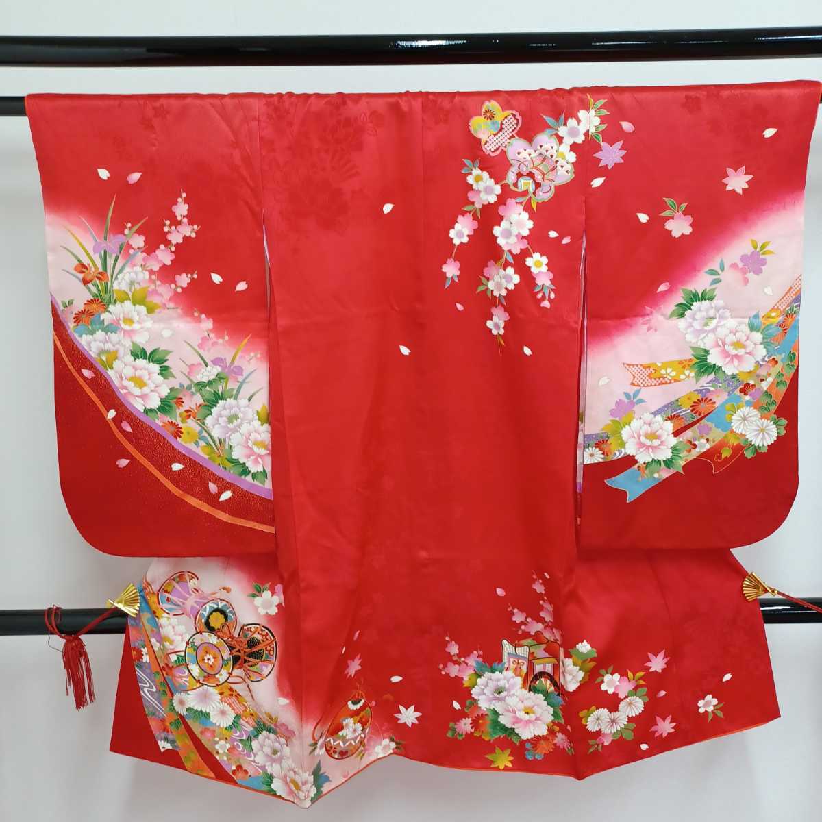 - 【石七82】七五三 着物 女児 3歳 赤 子供 式典 花 御所車 鼓 華やか 上品 可愛い おしゃれ 220531