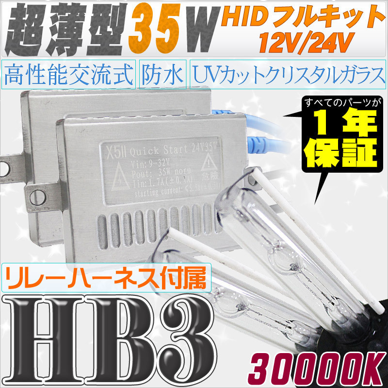 > 高性能 薄型HIDキット 35W HB3 リレー付 30000K 12V/24V 【交流式バラスト&クリスタルガラスバーナー】