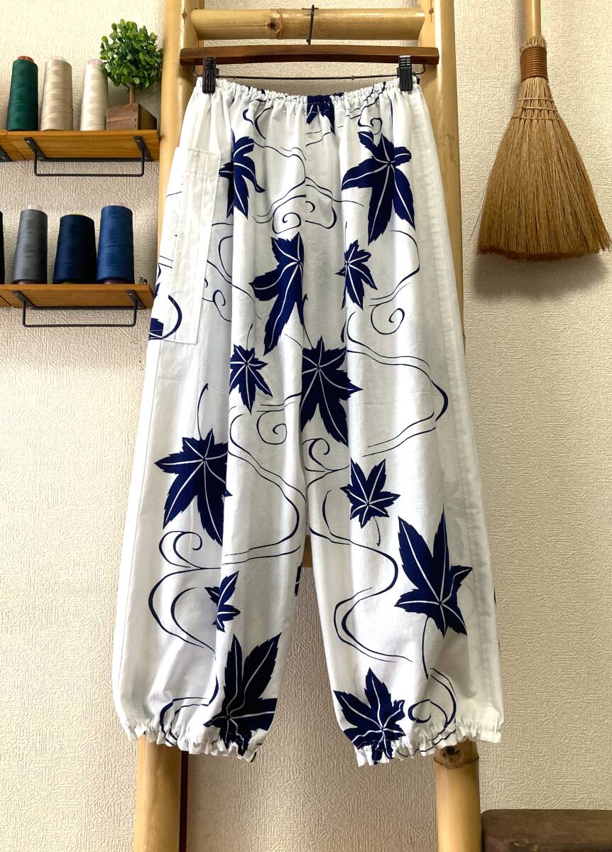 - 鎌倉まるか堂 浴衣リメイク 涼み 白紺の椛流水もんぺ風 ●綿 ●なんだか寒いのでセール ●M~L●裾ふわパンツ●洗濯OK