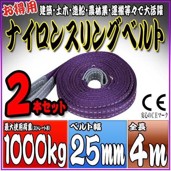 > スリングベルト2本セット 4m 幅25mm 使用荷重1000kg 1t 1.0t 吊りベルト ベルトスリング [ナイロンスリング 吊上げ ロープ 牽引 運搬]