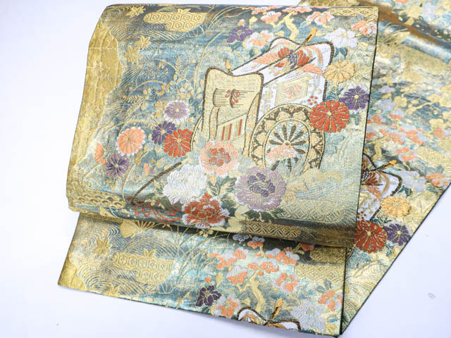 - 《京都一輝堂》【着物】袋帯 六通柄 金糸 ヱ霞に御所車 古典花 蝶文 24b-2836