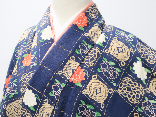 - 《京都一輝堂》【着物】 小紋 格子に花文 重ね衿付き 身丈約160cm 裄丈約60cm 24z-4868