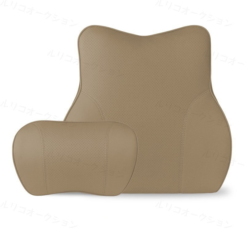 - 【ベージュ】車シートクッション4個セット ネックパッド腰クッション 腰痛対策 頚椎サポート 革製首枕 腰当て