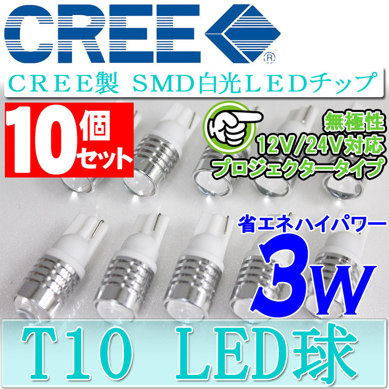 - 送料無料 CREE LEDチップ搭載 T10/T16 3W LEDウェッジ球10個セット スモールランプ プロジェクター仕様でより明るく! 無極性 12V/24V