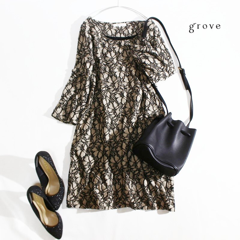 - 美品 グローブ grove 合物 刺繍 フラワー ジャージ― レースワンピース 9号 M ブラック 黒 ベージュ 綺麗め プルオーバー 秋 春