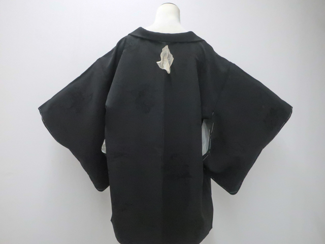 > 《古美術京松》リサイクル着物 羽織 黒羽織 一つ紋 地紋入り 羽織紐別売り 正絹 身丈約83.5cm 裄丈約64.5cm kyo7z08-993