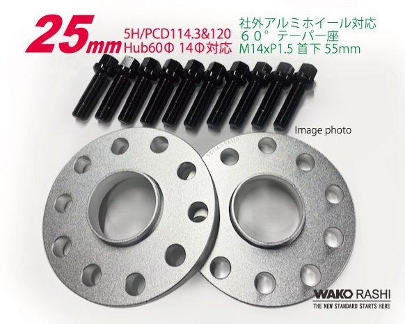 - クラウン(SH35系) 25mmスペーサー(5H/114.3 60Φ)とロングボルト(60テーパー座 首下55mm)10本のセット /和広 WAKO