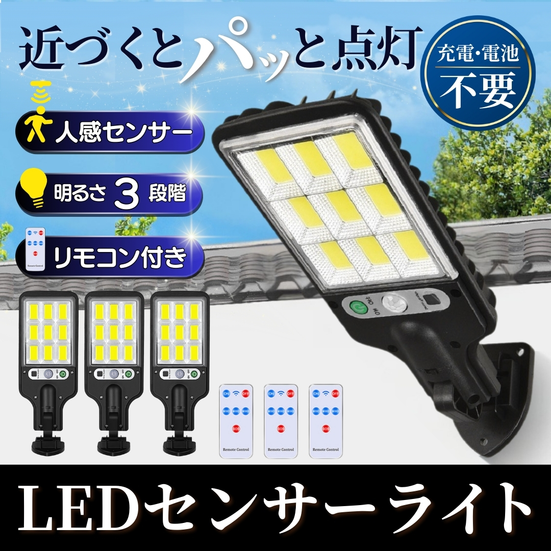 - 108COB ソーラーセンサーライト LED 3個セット 人感センサー 防犯 屋外 明暗 リモコン 誘導式街路灯 防水 照明 ガーデンライト 点灯 自動
