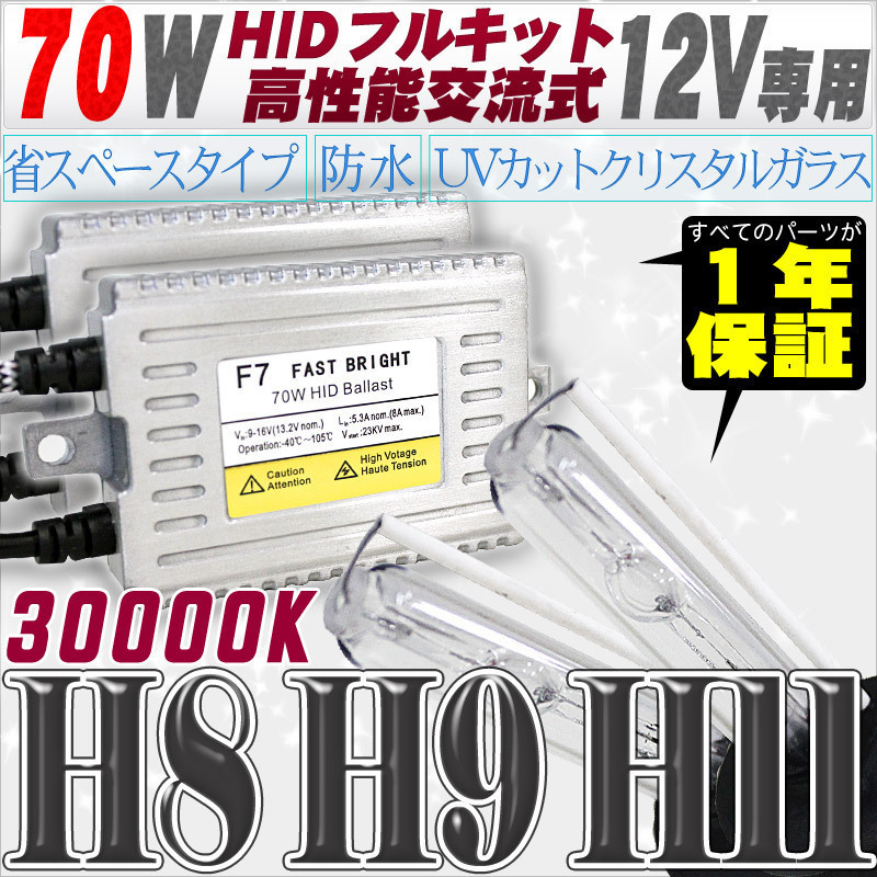 > 高性能 HIDキット 70W H11/H8 リレー付 30000K 【交流式バラスト&クリスタルガラスバーナー】 12V用