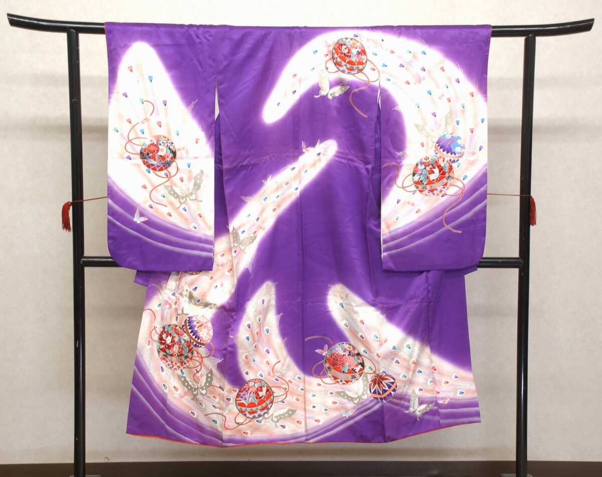 > ☆子供用☆女の子 7歳用 紫 孔雀の羽にマリと蝶 金銀彩 伊達衿付 四つ身 日本製☆七五三/正月☆キレイ