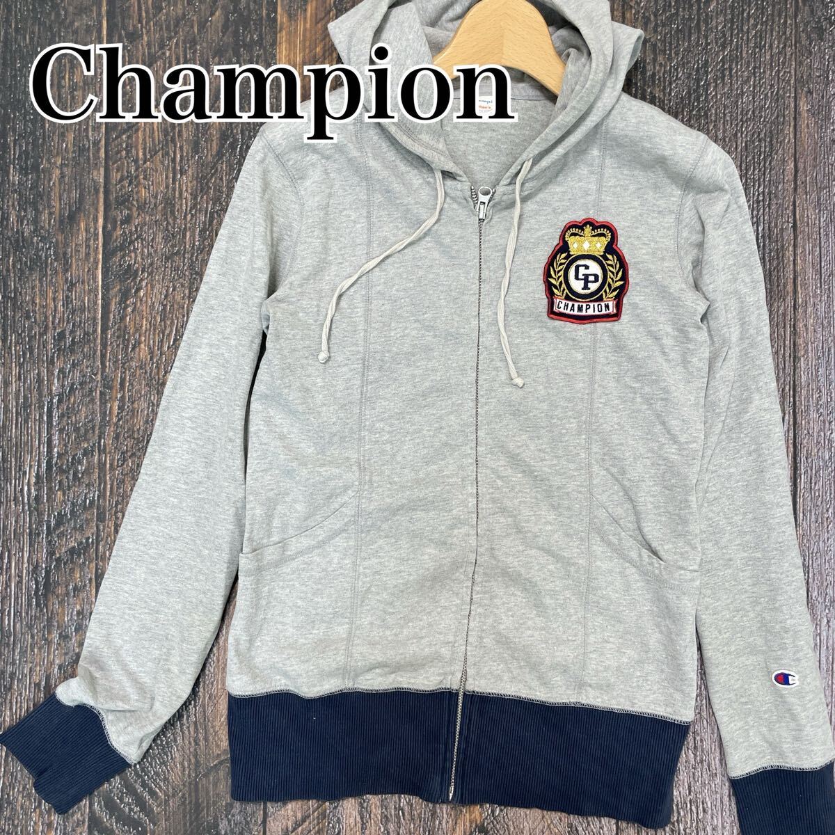 > Champion チャンピオン パーカー スウェット ジップアップ トップス Mサイズ M グレー × 黒 ブラック 長袖 フーディー フード ロゴ入り