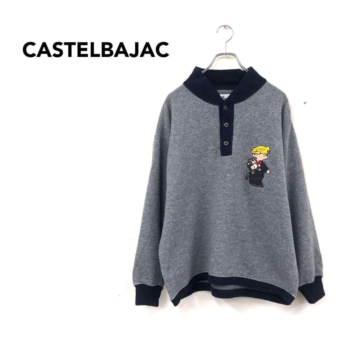 > 2O1072-G◆ CASTELBAJAC カステルバジャック イタリア製 バイカラーハーフボタン刺繍ニット リブ キャラクター ◆ グレー ウール 綿