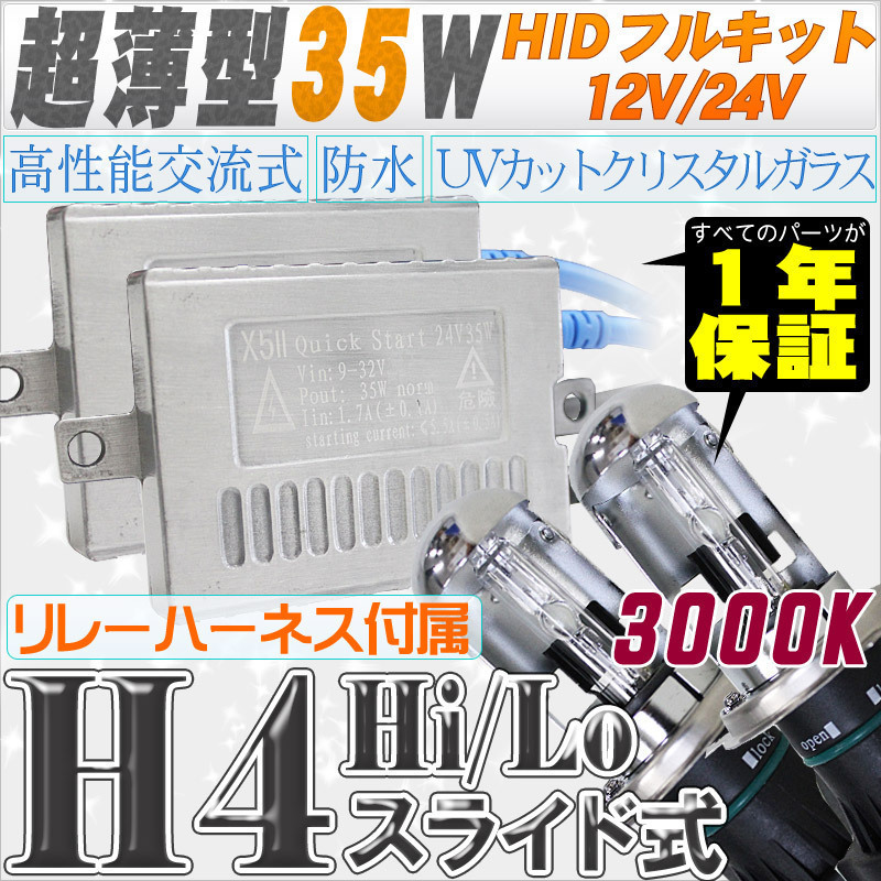 - 高性能 薄型HIDキット 35W H4 Hi/Lo スライド式 リレー付 3000K 12V/24V 【交流式バラスト&クリスタルガラスバーナー】