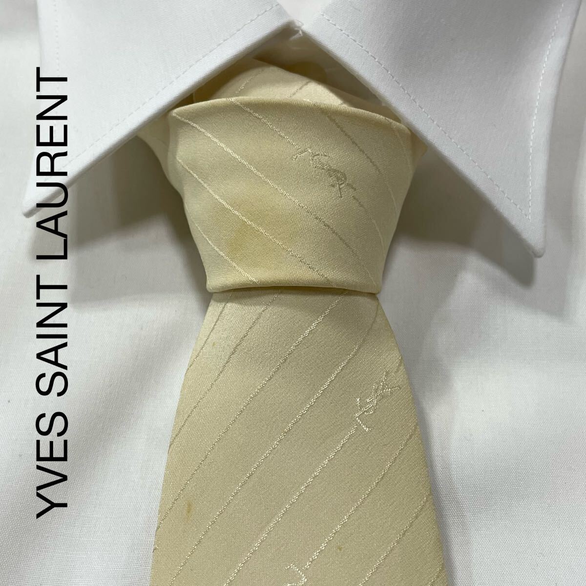 - YVES SAINT LAURENT イヴサンローラン ロゴ 刺繍 ストライプ シルク ネクタイ クリーム TG2929