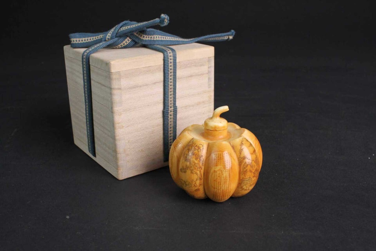 - A1266 唐物 鼻煙壺 南瓜 山水人物図 天然素材 東洋彫刻 時代物 【】# 重149g