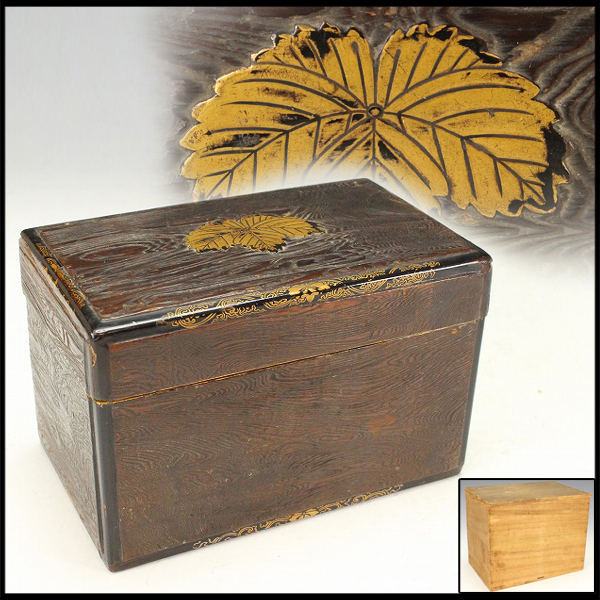- 【金閣】茶道具 高級漆器 銘木 彫刻 桐葉蒔絵 時代 茶箱 仕覆 時代箱 旧家蔵出 送料無料(RB226)