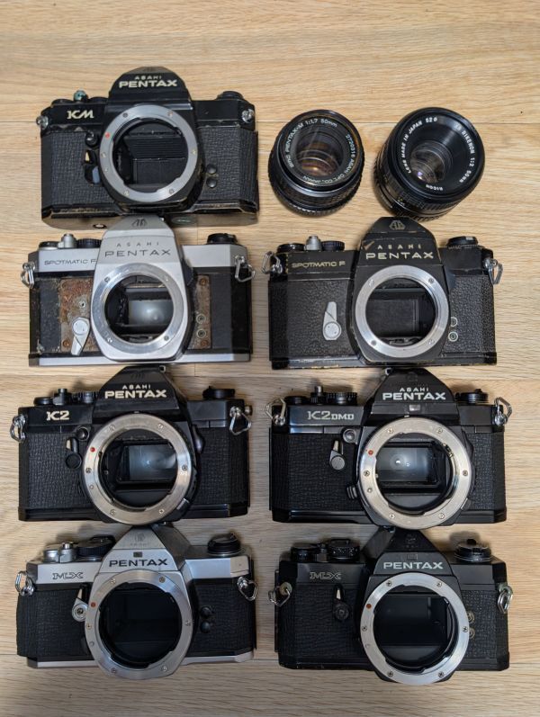 - 【1円スタートジャンク】PENTAX フィルム一眼レフ 7台&レンズ2本セット MX×2 K2×1 K2DMD×1 KM×1 SPF×2 動作未確認