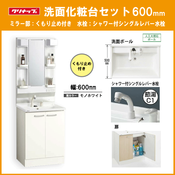 - 洗面化粧台セット(ミラー部くもり止め付き) シャワー付きシングルレバー水栓 幅:600mm BGAL60TNTVWJTS,M-L601GAEH クリナップ BGAシリーズ