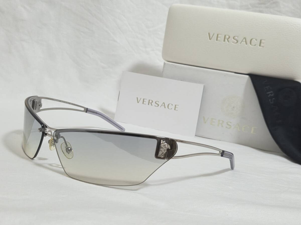 > 正規良 VERSACEヴェルサーチ メデューサロゴ フレームレスサングラス 黒系青 メタルSV オープンカットレンズ グラマラスアイウェア 付属有