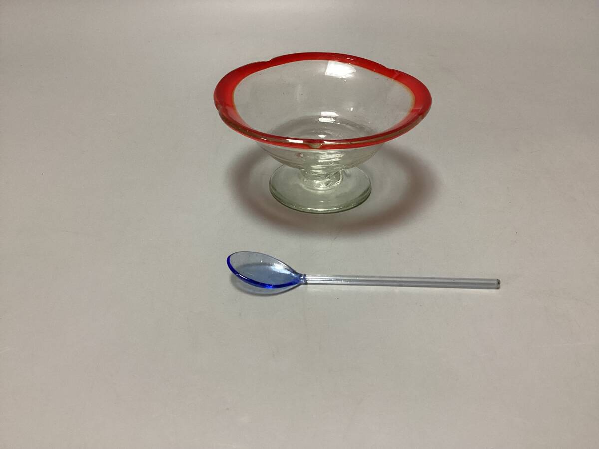 - 輪花 縁赤 氷コップ 古いガラススプーン1本おまけ付 売り切り 画像判断でお願いします (検) 和ガラス ウランガラス