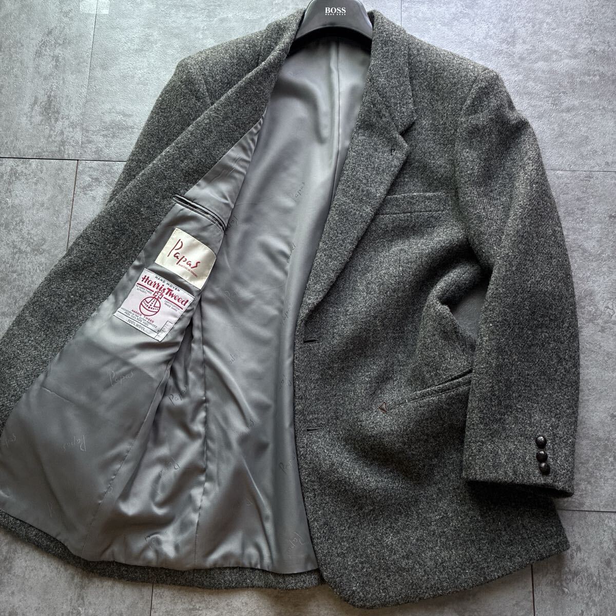- 【美品・L相当】Papas パパス Harris Tweed ハリスツイード テーラードジャケット グレー くるみボタン メンズ ビジネス 秋冬定番 ブレザー