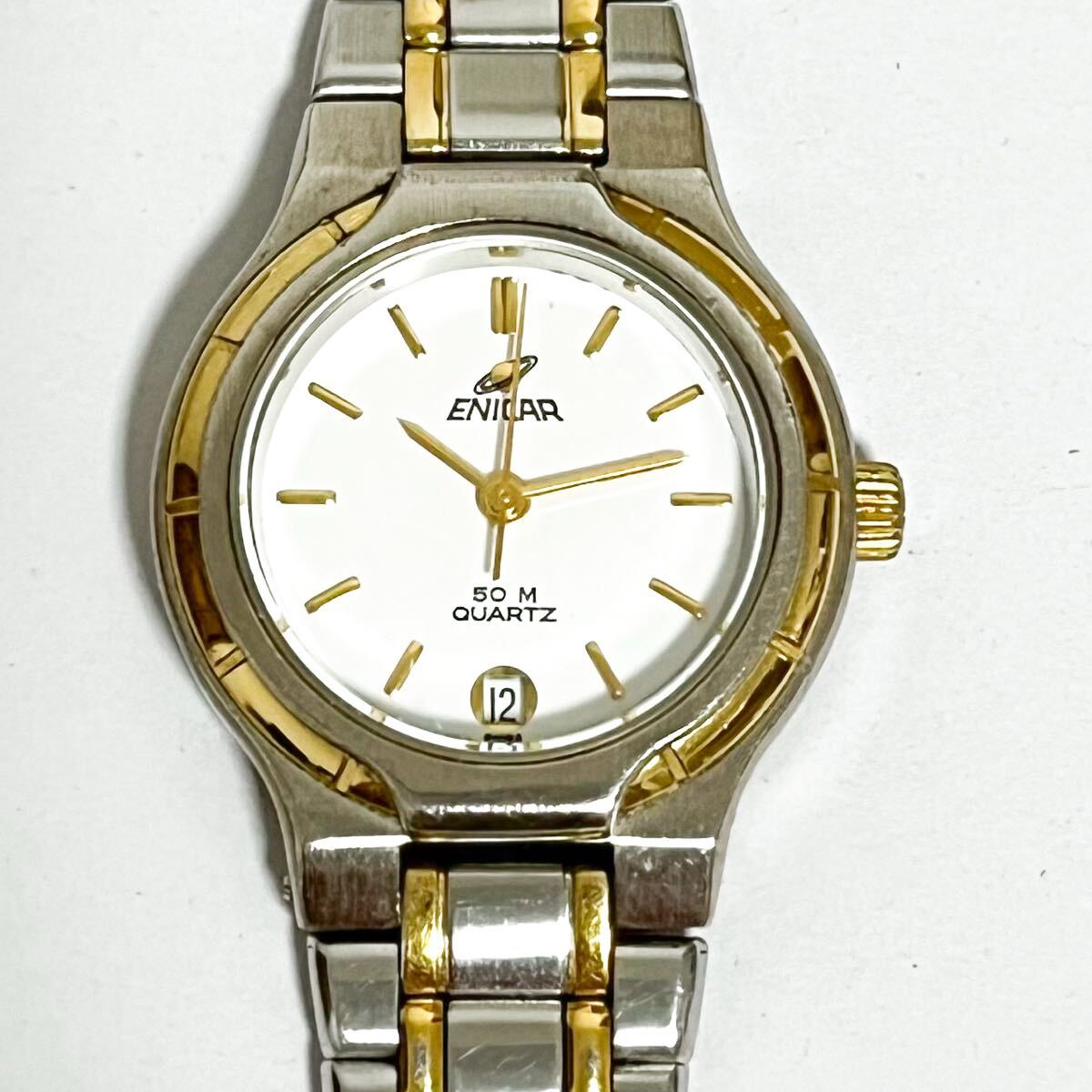 > 和854★ ENICAR 956388 エニカ クォーツ 腕時計 ウォッチ 3針 日付 ホワイト メタルバンド レディース