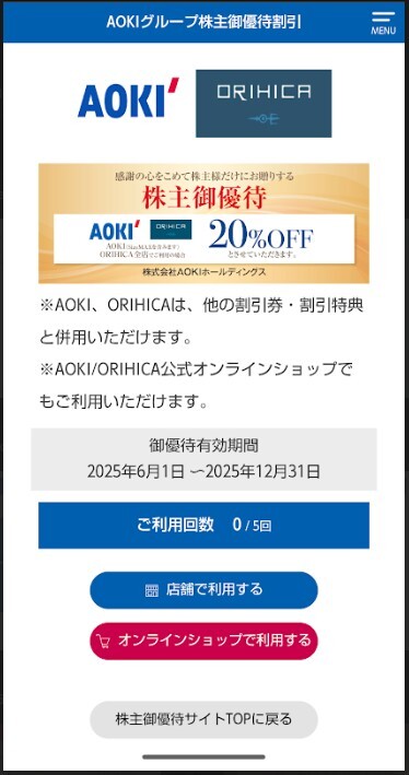 - 【即決】AOKI 株主優待 公式オンラインショップ 割引券(数量6)アオキ オリヒカ 優待券 クーポン