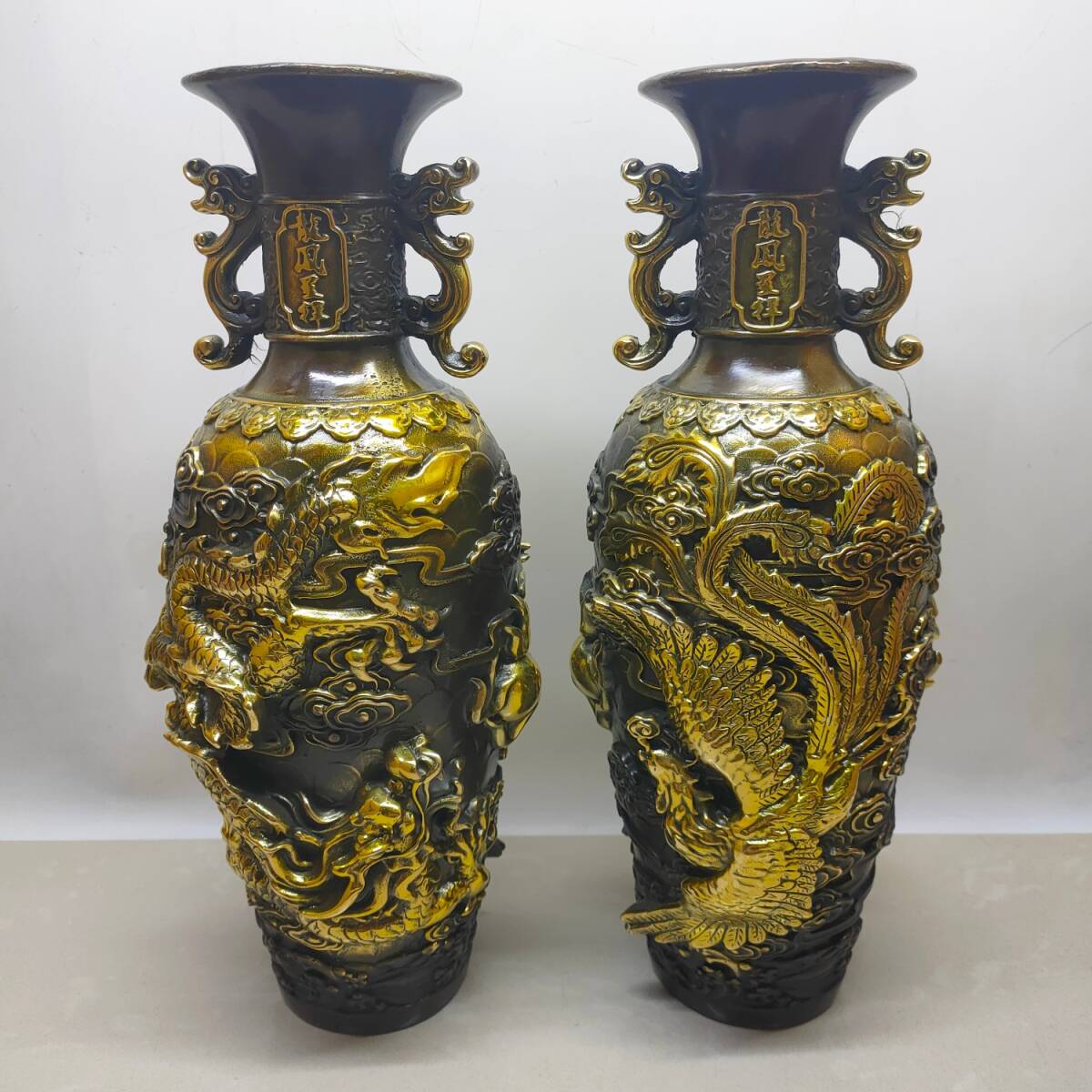 - 『館蔵珍品 紫銅製 塗金 龍鳳呈祥紋 花瓶一對 置物 賞物』稀少珍蔵品 古賞物 貴重物品 収蔵品 中国古美術 時代物 古董品