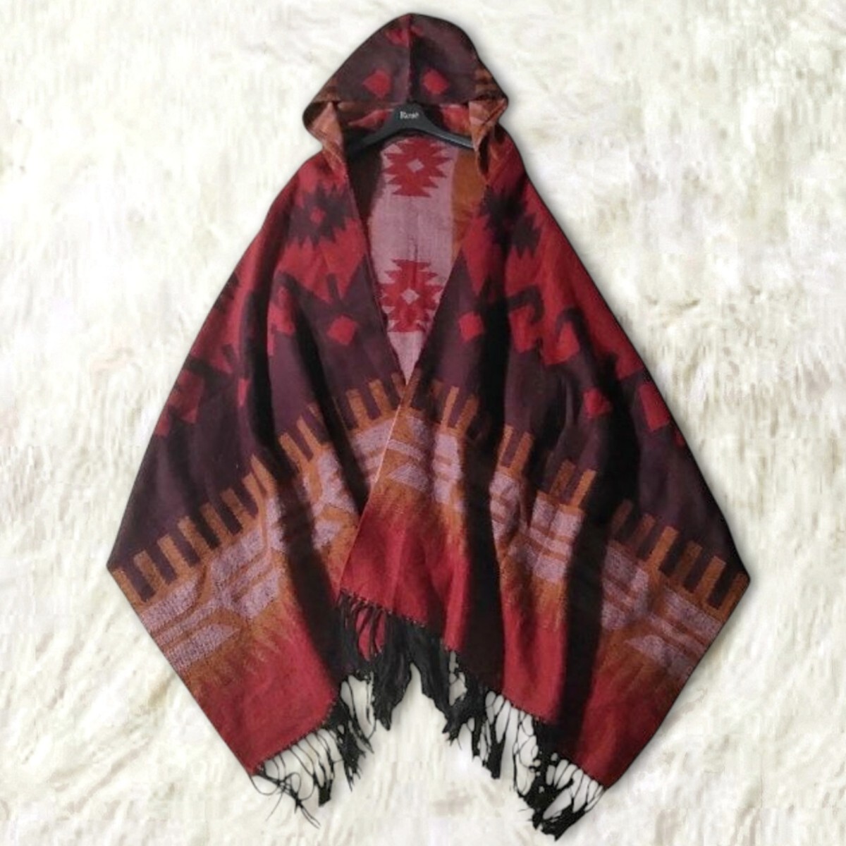 - ポンチョ ストール マフラー ケープ 総柄 パープル レッド 個性的 アジアン エスニック 防寒 フード 起毛 フリンジ アウトドア 秋冬