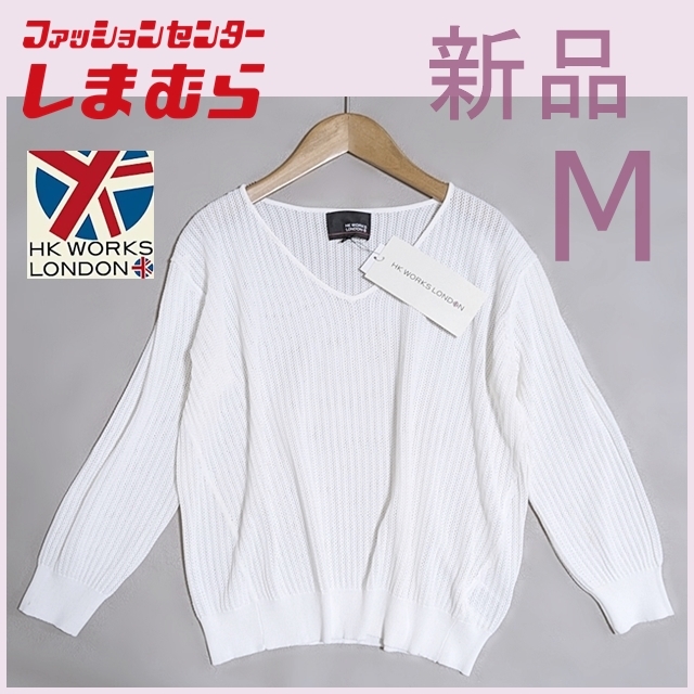 > 新品 未使用 しまむら HK WORKS LONDON Vネック メッシュ サマーニット 七分袖 五分袖 カットソー 白 薄手 半袖 透かし編み 透け シアー