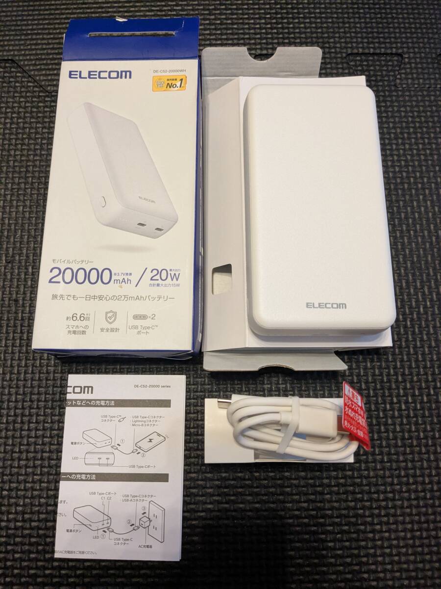 > ◎0710u0943 エレコム モバイルバッテリー 20000mAh 20W USB PD対応 2ポート Type-C ケーブル付属 ホワイト DE-C52-20000WH