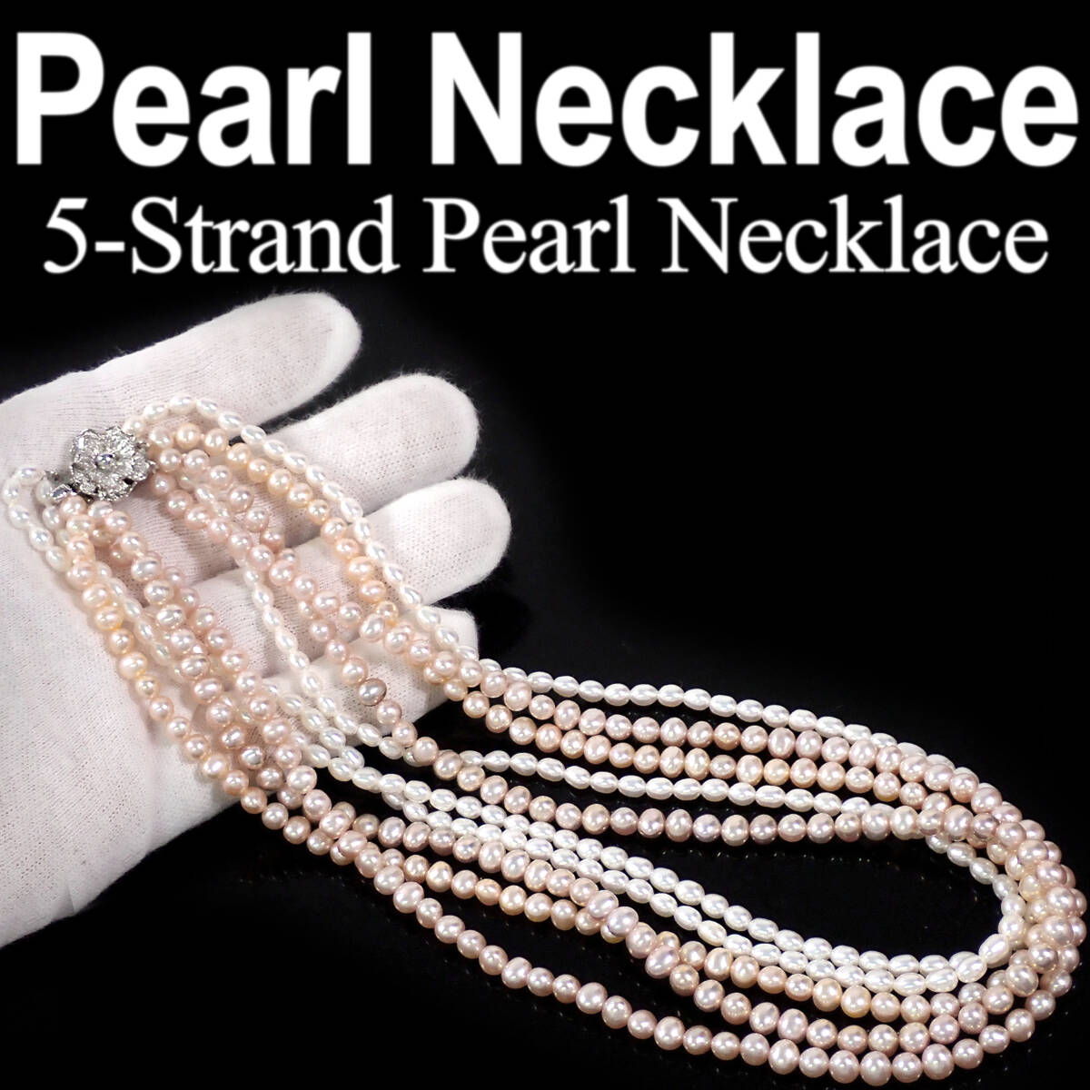 - 本真珠 5連 ピンク パールネックレス 3.3-5.6mm 42cm 61g PINK PEARL 5-Strand Ppearl Necklace
