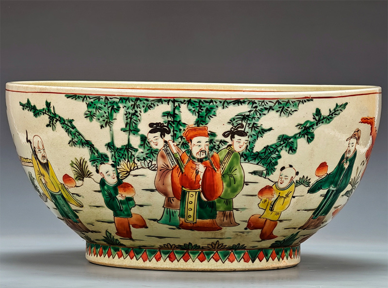 > yfa|0234 中国磁器 陶芸 磁器『【大明万暦年制】五彩通景『八仙賀寿』人物紋聚宝盆です』施釉陶 古代工芸品 陶芸 精美彫 置物 收藏品