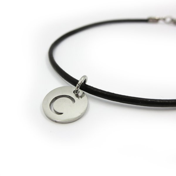 - C レザーアンクレット イニシャルチャーム付き ラウンド型 ステンレス金具 28cm(24+4cmアジャスター)