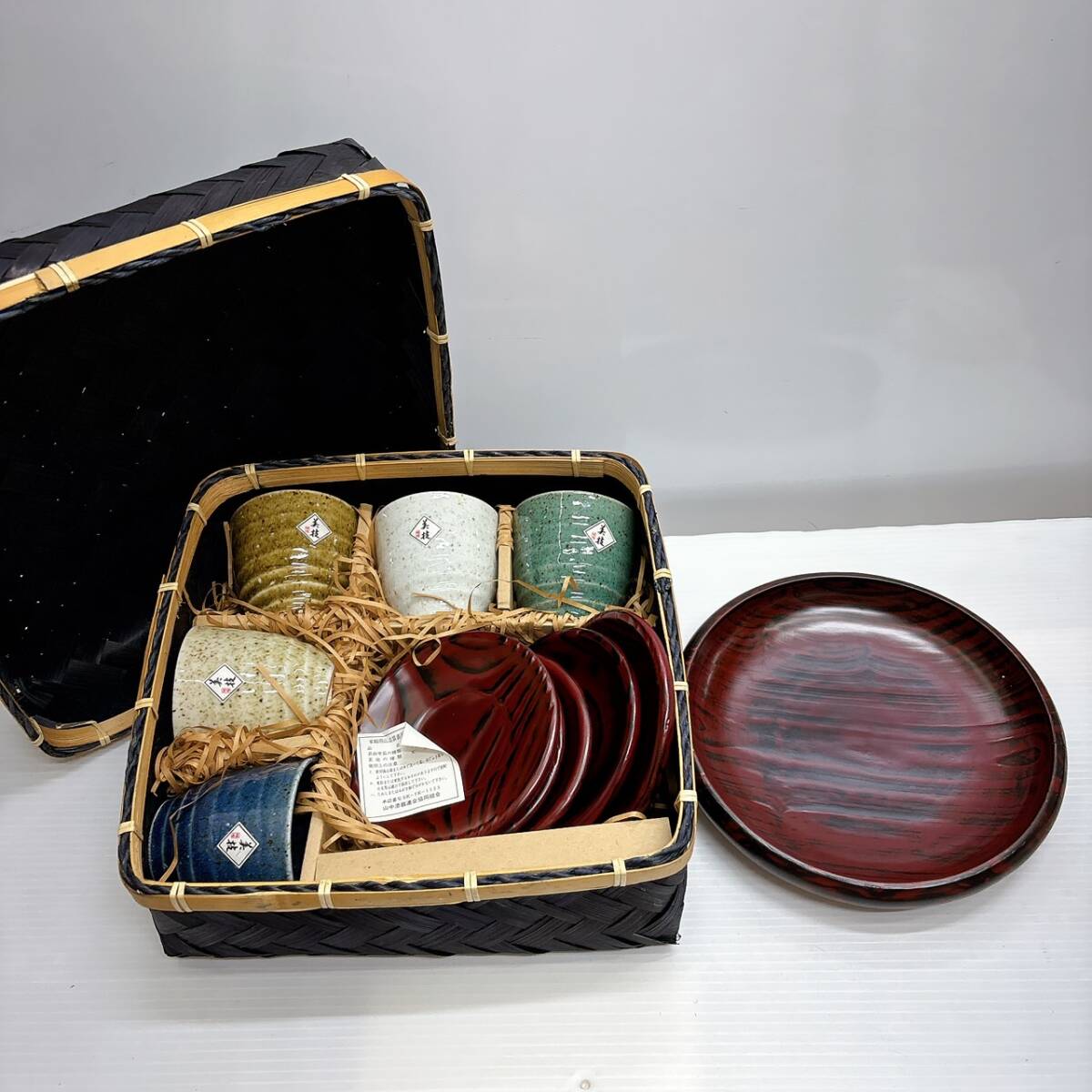 - 送料無料h9187 明陶 美枝 陶器製湯飲み 5個セット フリーカップ 籠入り お盆 茶托 食器 未使用
