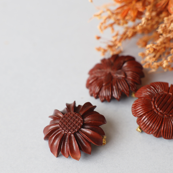 - 新作 手彫り ウッド ブローチ ウッドカービング 天然木 花 モチーフ ダークブラウン Q14C
