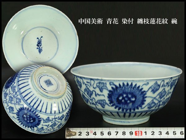 - 【銀閣】中国美術 青花 染付 纏枝蓮花紋 碗 φ18cm 旧家蔵出 送料無料(N809)