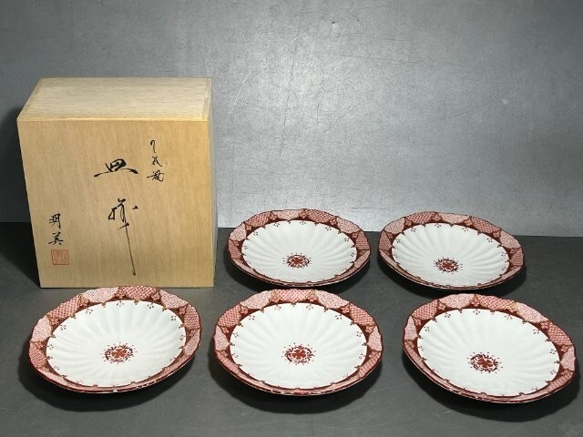 - 九谷焼 九谷 明美・作 金彩 赤絵小紋 11.5cm 5客 木箱入り 和食器 プレート