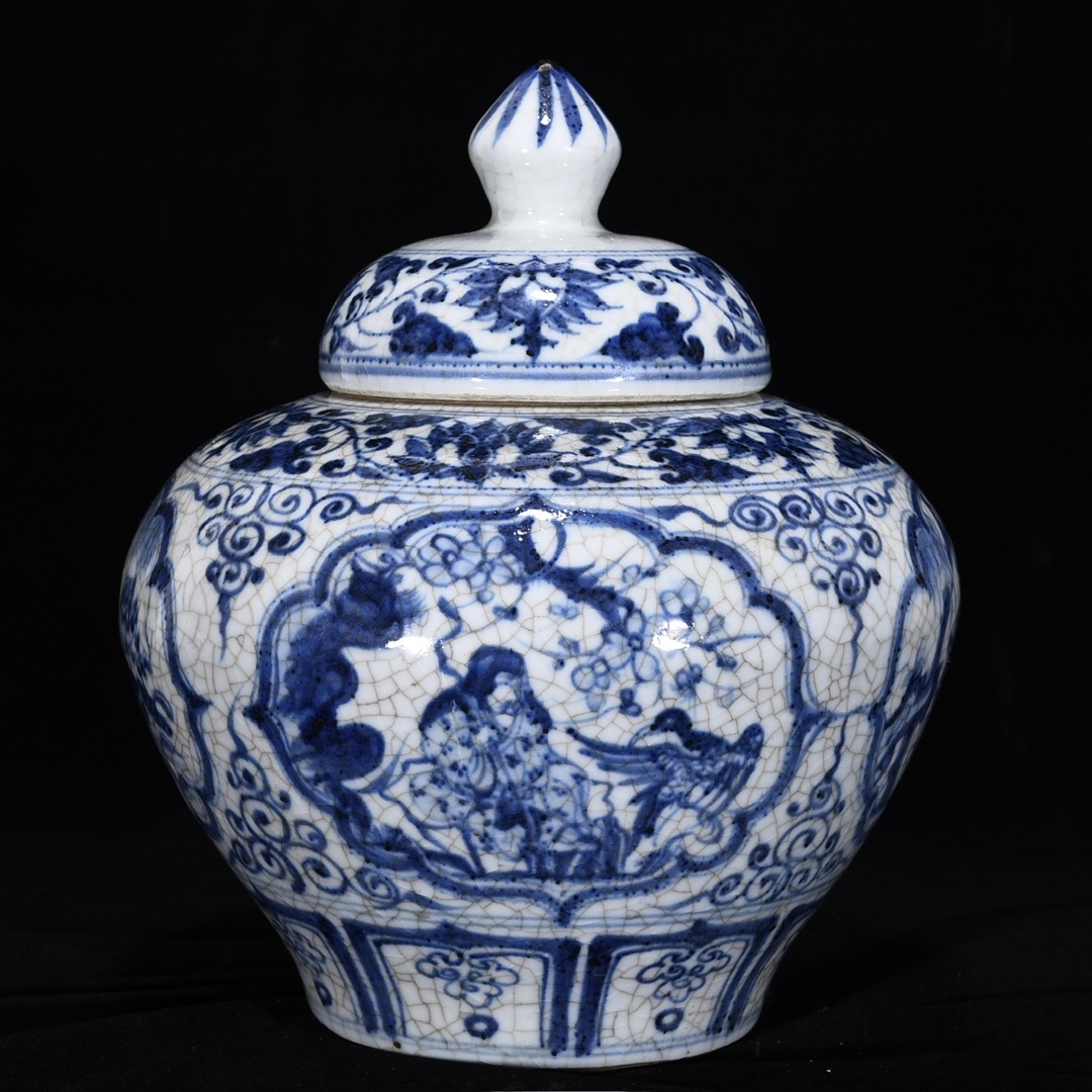 - A:0444KM 人間国宝 中国骨董 磁器【元青花開片四愛人物物紋蓋缶】工芸品 施釉陶 青花磁 陶芸 置物 收藏品