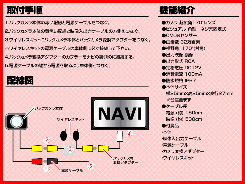 - ホンダ VXM-175VFi 固定式 バックカメラ/入力変換アダプタ ワイヤレス 付 ガイドライン 汎用 リアカメラ