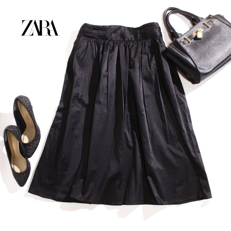 > 美品 ZARA BASIC ザラ ベーシック 通年 着回し シンプル ギャザー ミモレ丈 フレアスカート スカート S ブラック 黒 定番 秋 春 オフィス