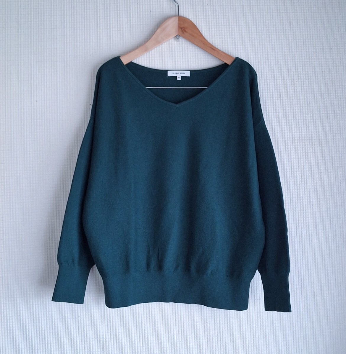 - ★GLOBAL WORK 未使用に近い 羊毛カシミヤ混 Vネックニット 緑 M★