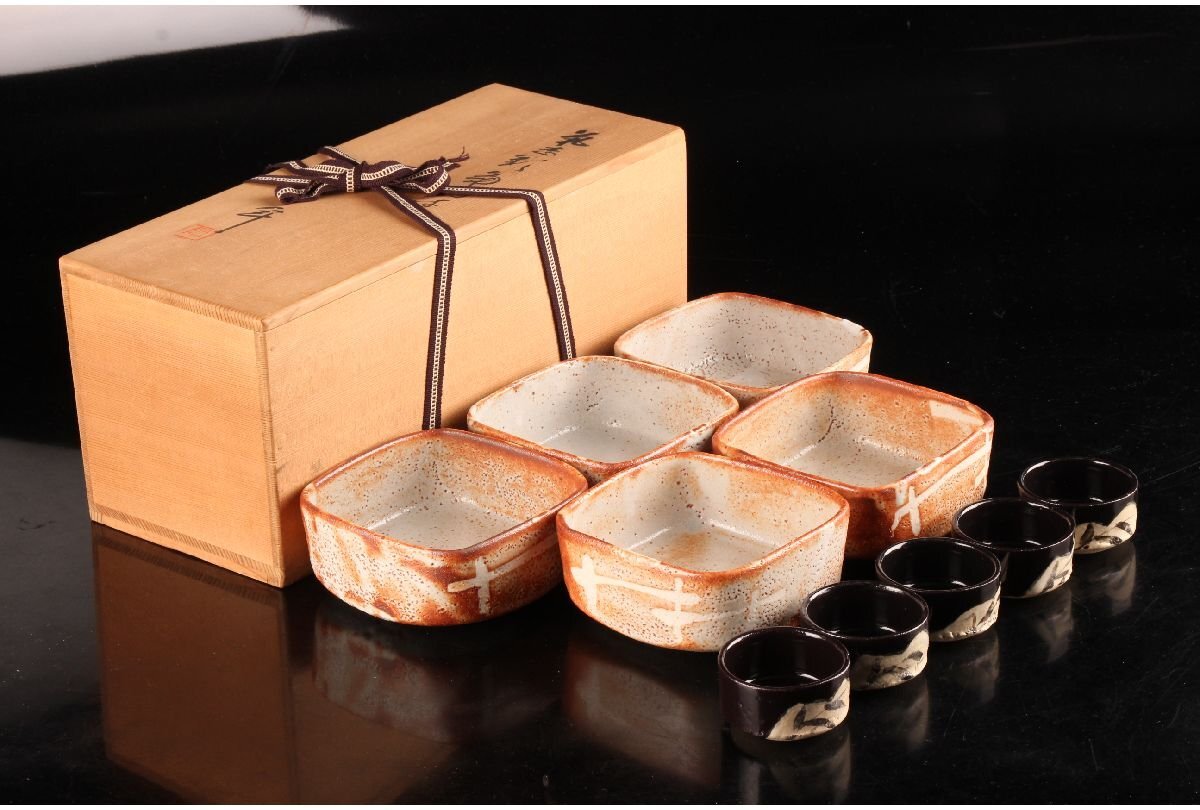- [URA]加藤卓男/鼠志野角向付5客・黒織部豆鉢5客/共箱/4-10-49 (検索)骨董/美濃焼/刺身皿/小皿/刺身鉢/小鉢/向付/茶碗/懐石道具/懐石料理