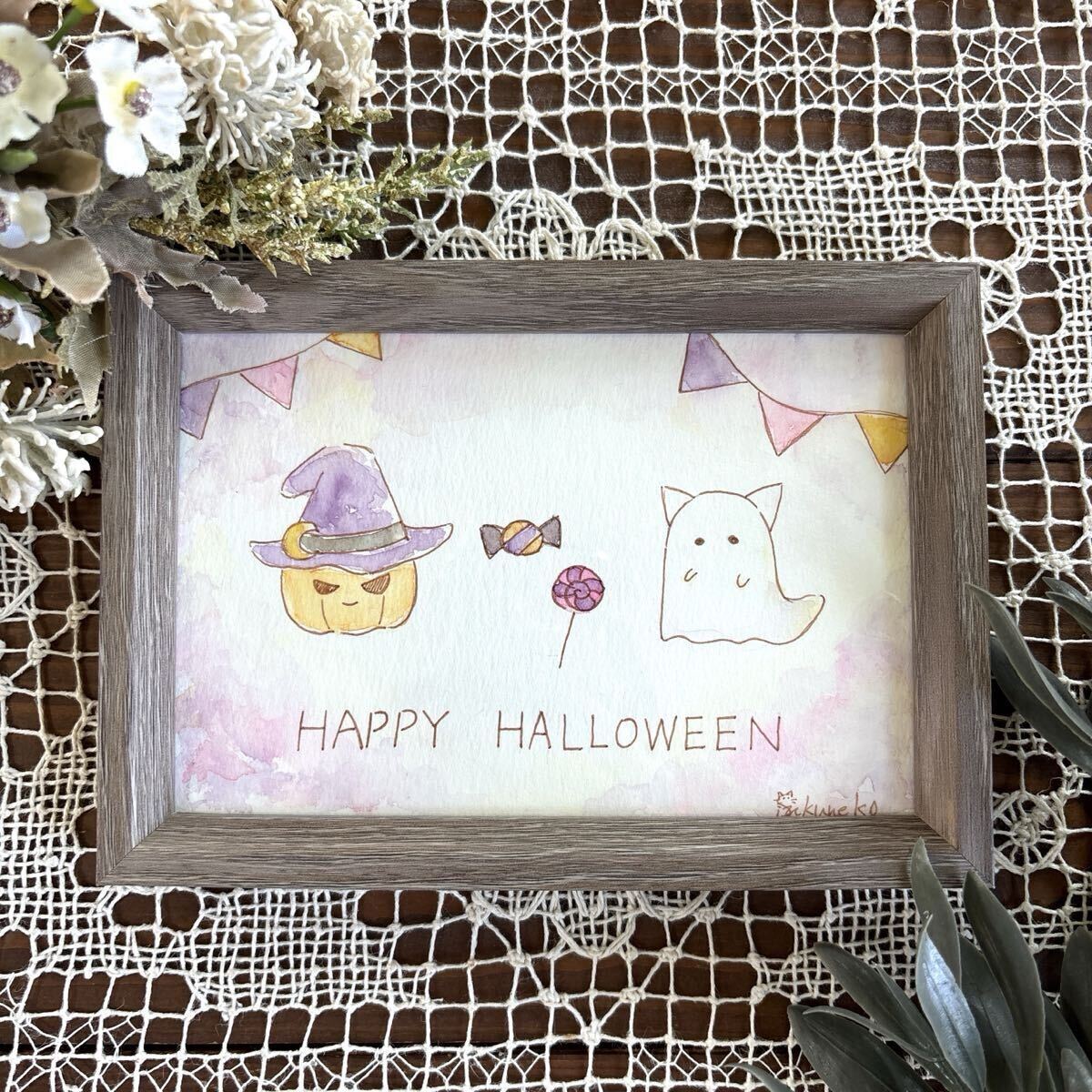 - 雫猫 nyago 水彩画 ハロウィン 秋 絵 絵画 イラスト 手描き 画家 真作 原画 美術 額装 インテリア アート ハンドメイド インテリア雑貨